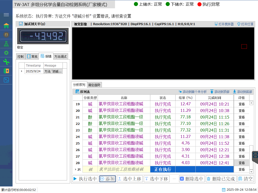 2、適用于所有通過顏色變化判斷終點(diǎn)的檢測項(xiàng)目,同時增加采集效率,提高幀率及氣泡過濾,有效保證顏色終點(diǎn)的預(yù)判斷和最終判定,通過算法解決普通電位滴定反饋效率低的問題,大大縮短滴定時間,最快可以2分鐘完成液堿檢測。